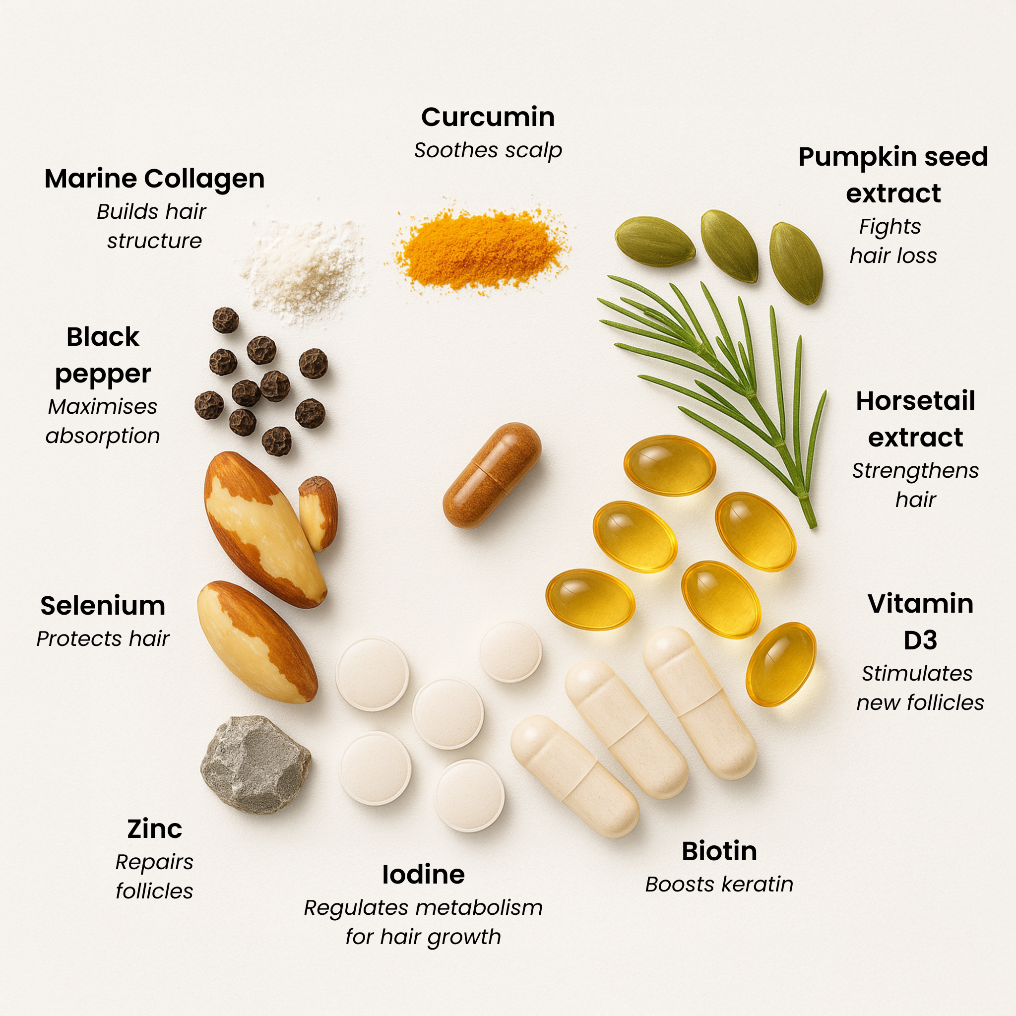 Pumpkin Seed Extract is traditionally used in hair supplements and is included to support hair density and normal hair maintenance.